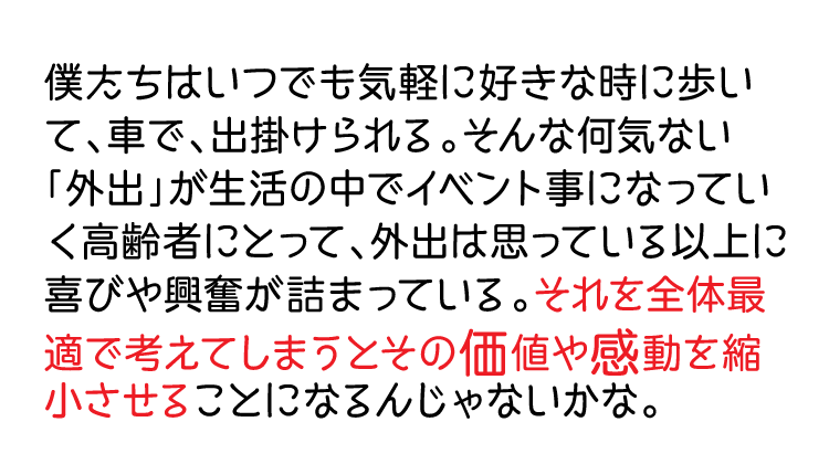 全員参加、全員平等の正義でサービスを作るってことは、今なら行けた人達の「外に出掛ける機会を奪ってしまう」ことでもあるよね。と。