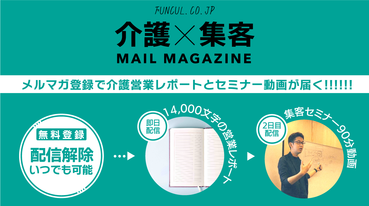 「デイサービス集客のヒントが見つかる!」と話題の”介護集客セミナー動画(90分)”をプレゼント!さらに、完全書き下ろしの”集客レポート(14,000文字)”も無料配布中です。デイサービスや介護施設の集客力アップに役立つヒントが盛りだくさんの内容です。ぜひこの機会にセミナー動画&レポートをGETしてください。